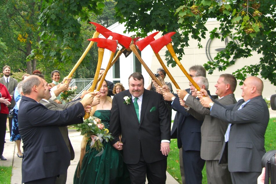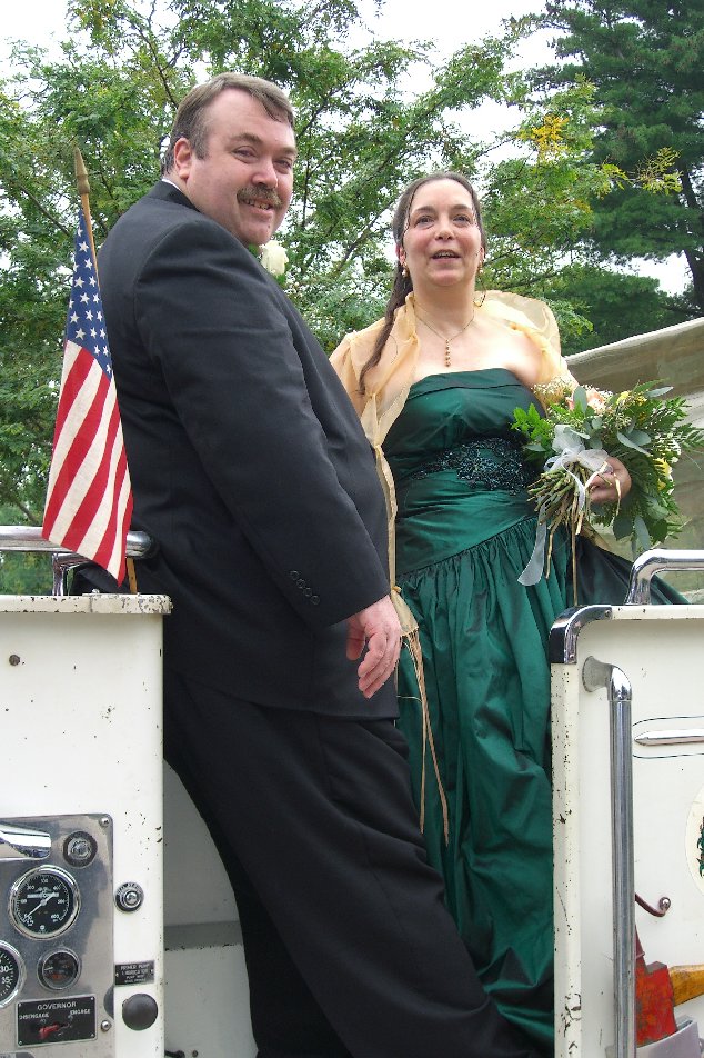 Following the ceremony, Louann and I walked under an arch of fire axes to board a 1958 American LaFrance pumper for the ride to our recpetion.