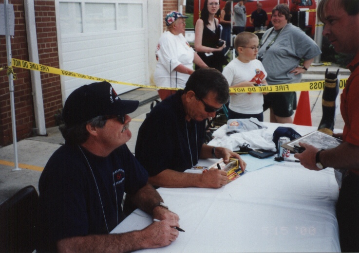And here you'll see actor Tim Donnelly, who played Firefighter Chet Kelly, and retired Firefighter Mike Stoker, who played himself on the show. Stoker was the only actual LA County firefighter that was a regular on the series. |